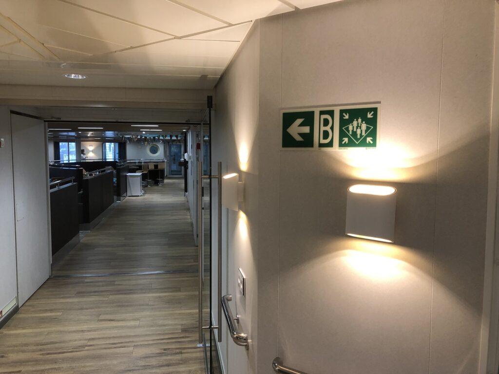 De duidelijk gemarkeerde vluchtroutes op ooghoogte zorgen ervoor dat iedereen aan boord gemakkelijk de snelste weg naar veiligheid (de assembly stations) kan vinden, zelfs in stressvolle situaties.